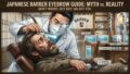 A stylish anime illustration of a young man pointing at a map to explain his desired haircut to a professional Japanese barber in a moody, modern barbershop. ブログ